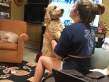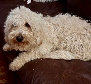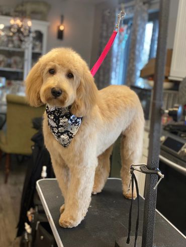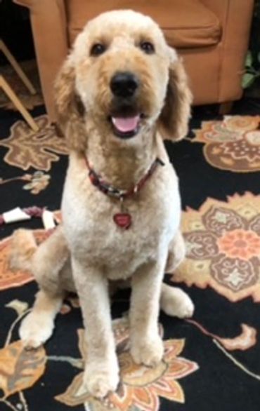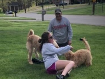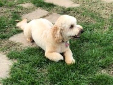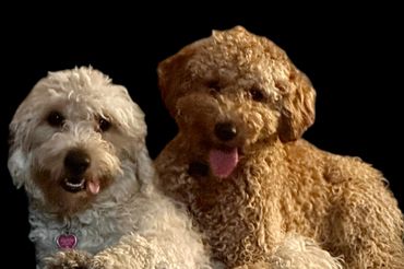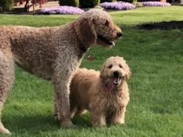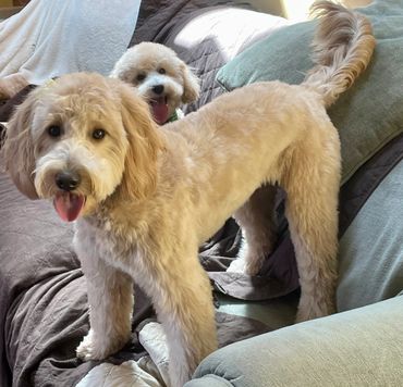 Mylee is our standard F1B golden doodle. She’s has been retired and is living as the queen bee in our house Our sire is a spunky F1 miniature golden doodle named Cyrus...(a first generation cross between a golden retriever and miniature poodle). He weighs in at 27 lbs and is 12 inches tall! He loves attention and has low to no shedding. He has been OFA hip tested “Good”