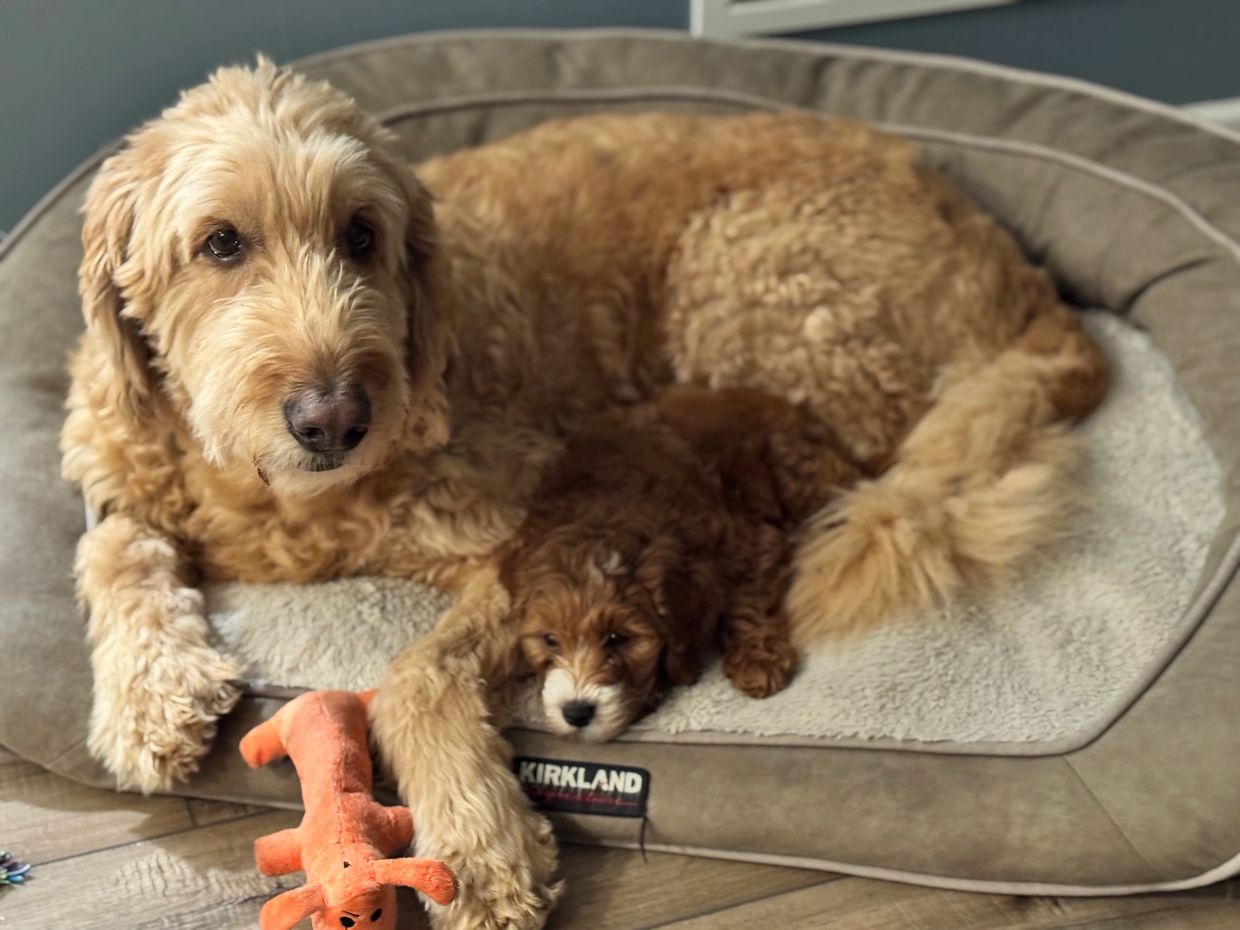 Stella is 3 years old and the little girl from Mylee’s last litter. Cyrus is her dad. Moose is their newest family member. He is 8 weeks old, an F2B mini golden doodle whose parents are Pepper and Biscuit! So wonderful to have families continue to be part of the KSchott Kennel family.